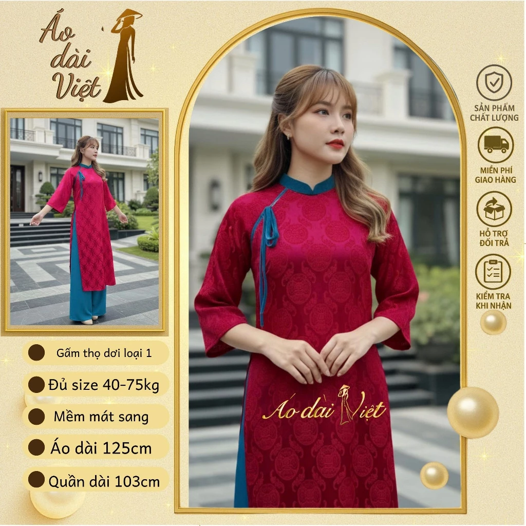 - Tên sản phẩm: Áo dài cách tân nữ Tết 2026 dáng suông gấm thọ dơi loại 1 cao cấp màu đỏ phối xanh đồng phục chụp ảnh nhóm may sẵn