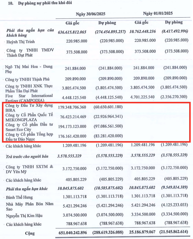 Thứ nhất, số dư khoản dự phòng phải thu khó đòi đã được Công ty trích lập tại ngày 31/12/2024 khoảng 21,5 tỷ đồng, nhưng đơn vị kiểm toán cho rằng Công ty chưa trích lập đầy đủ dự phòng phải thu khó đòi đối với một số khoản công nợ đã quá hạn thanh toán. Nếu trích lập đầy đủ, số dự phòng phải thu khó đòi tối thiểu cần trích lập bổ sung khoảng 193,2 tỷ đồng.