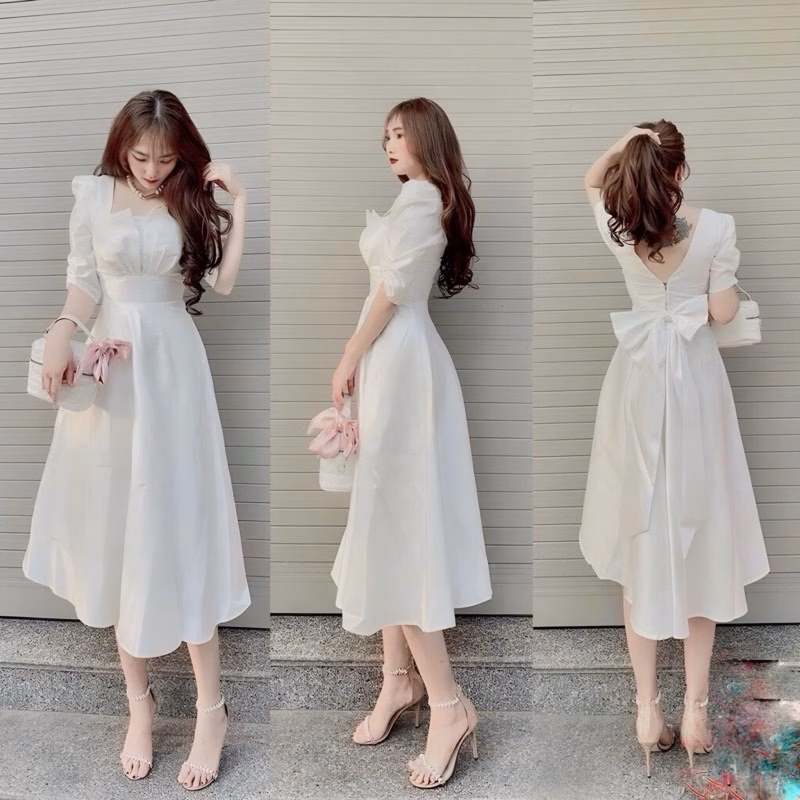 🔥 [Shop bigsize nữ 50kg đến 90kg] Đầm nữ dài ĐÍNH NƠ LƯNG đi tiệc cưới màu trắng, vàng, đỏ, đen – D55_Nơ đang giảm giá!